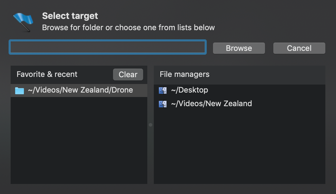 TeraCopy allows you to quickly select a folder that is currently open in Finder and use it as a destination.