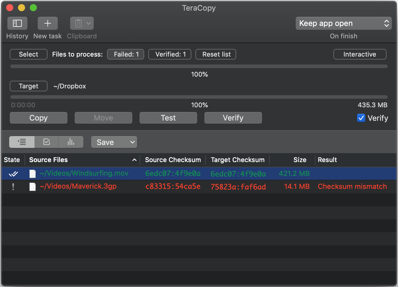 TeraCopy can verify files after they have been copied to ensure that they are identical. This is done by comparing hashes of source and target files.